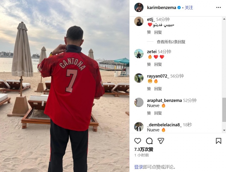 在社交媒体上,本泽马晒出了自己在沙滩上的背影照。有趣的是,他身披的是法国足坛传奇坎通纳的7号球衣。