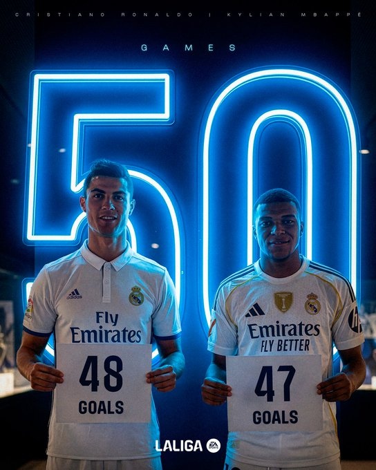 在西甲前50场比赛中,姆巴佩已打进47球,在联赛历史上仅次于打进48球的C罗。